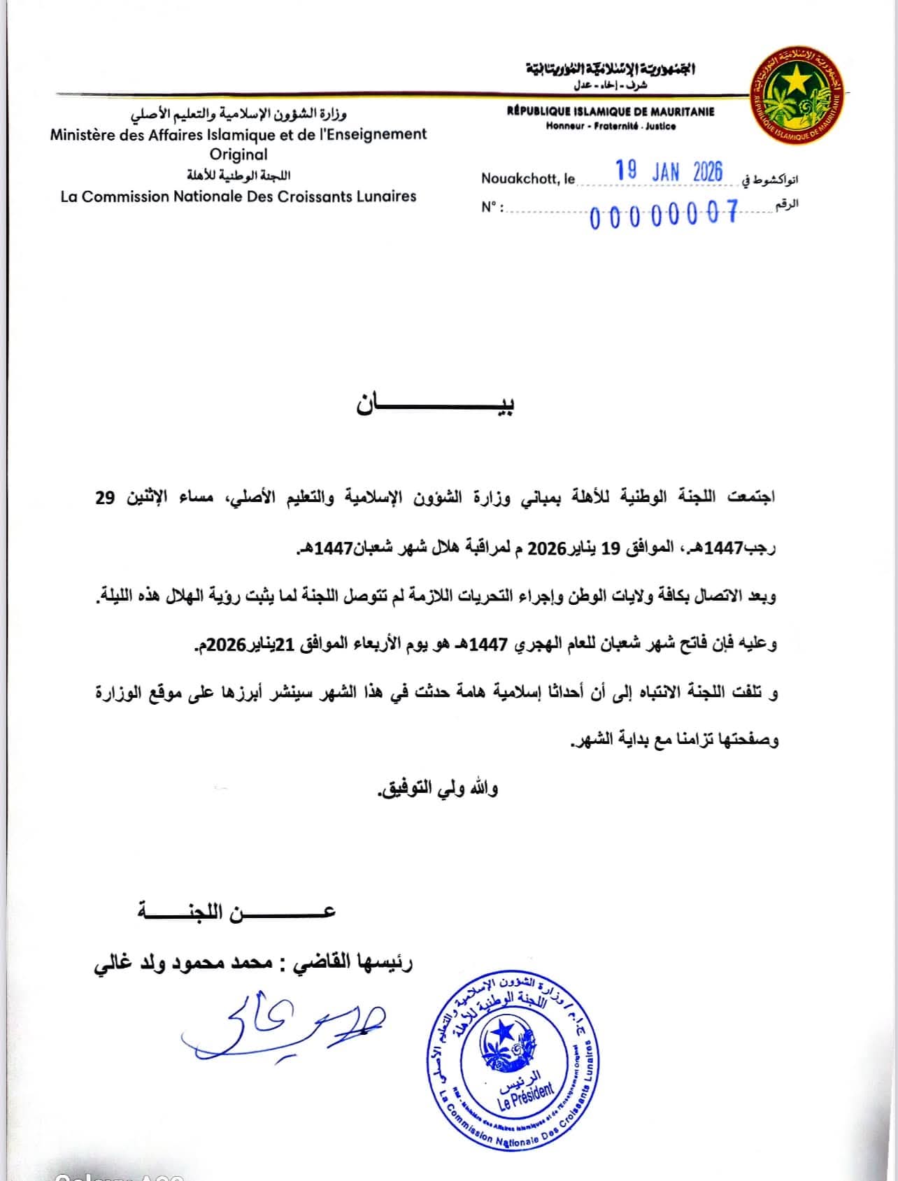 أعلنت اللجنة الوطنية للأهلة أن بعد غد الأربعاء الموافق 21 يناير 2026 هو فاتح شهر شعبان للعام الهجري 1447، مؤكدة أن يوم غد الثلاثاء هو المتمم لشهر رجب.