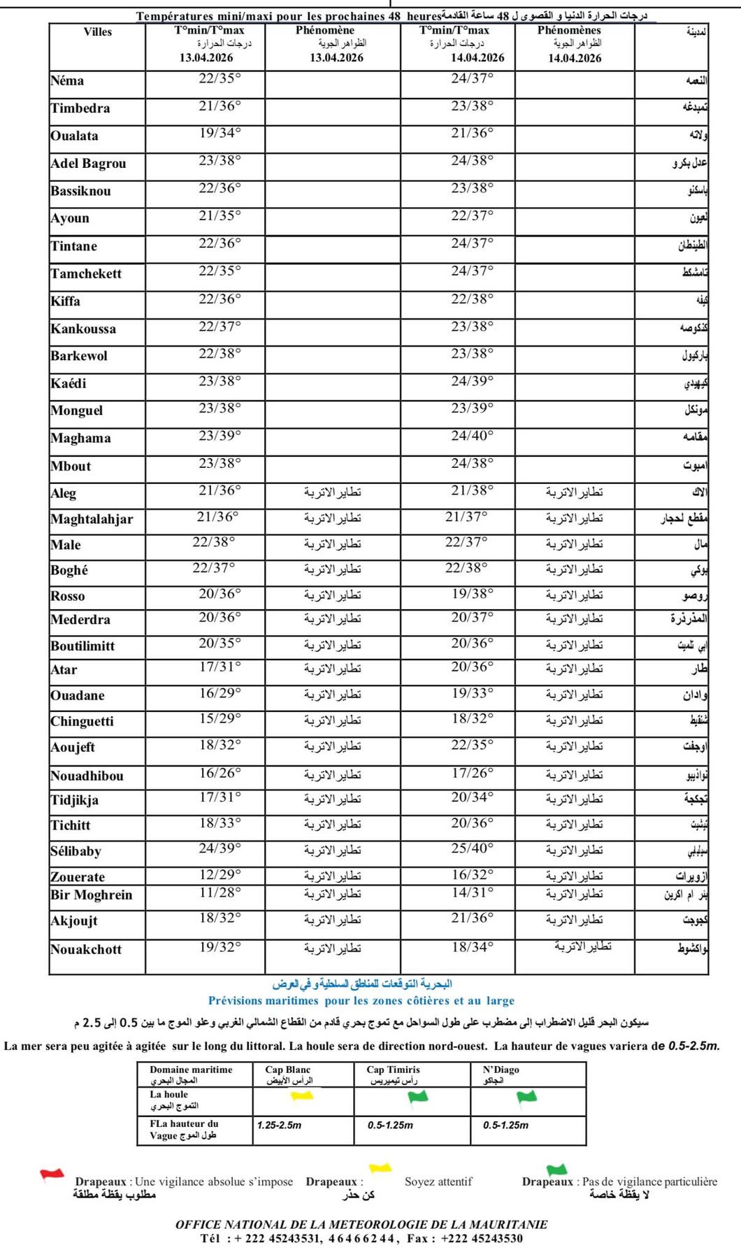 كما توقعت أن تكون السماء قليلة الغيوم إلى غائمة على المناطق الغربية والوسطى والجنوبية من موريتانيا.