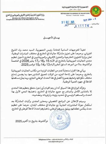 أعلنت وزارة الشؤون الخارجية والتعاون الإفريقي والموريتانيين في الخارج أنه؛ تنفيذا للتوجيهات السامية لفخامة رئيس الجمهورية، السيد محمد ولد الشيخ الغزواني، وحرصا على تعزيز مشاركة جالياتنا في الخارج في مختلف المبادرات الوطنية، تقرر تأجيل تنظيم منتدى الجاليات الموريتانية في الخارج إلى أيام 15 و16 و17 يناير 2026 في العاصمة نواكشوط، بدلا من الموعد السابق (13 و14 و15 نوفمبر 2025).